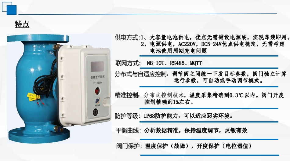 ⑩智能電動(dòng)調(diào)節(jié)閥具備24v交直流供電,支持RS485通訊和模擬量信號(hào),同時(shí)支持低功耗藍(lán)牙組網(wǎng)無線通訊和調(diào)試功能,是熱力站內(nèi)精調(diào)節(jié)控制器,支持兩路壓力、兩路溫度監(jiān)測,支持自動(dòng)溫差、溫度調(diào)節(jié)功能,具備承受較大的壓力差,工作時(shí)振動(dòng)較小,調(diào)節(jié)性能好,使用壽命長特性,廣泛應(yīng)用與城市集中供熱自動(dòng)控制系統(tǒng)中,是智慧熱力站整體解決方案重要組成部分。通過與云平臺(tái)、AI算法調(diào)控、嵌入式技術(shù)等深度融合,實(shí)現(xiàn)對熱力站一次、二次管網(wǎng)熱量、流量及溫度高效智能化調(diào)控。