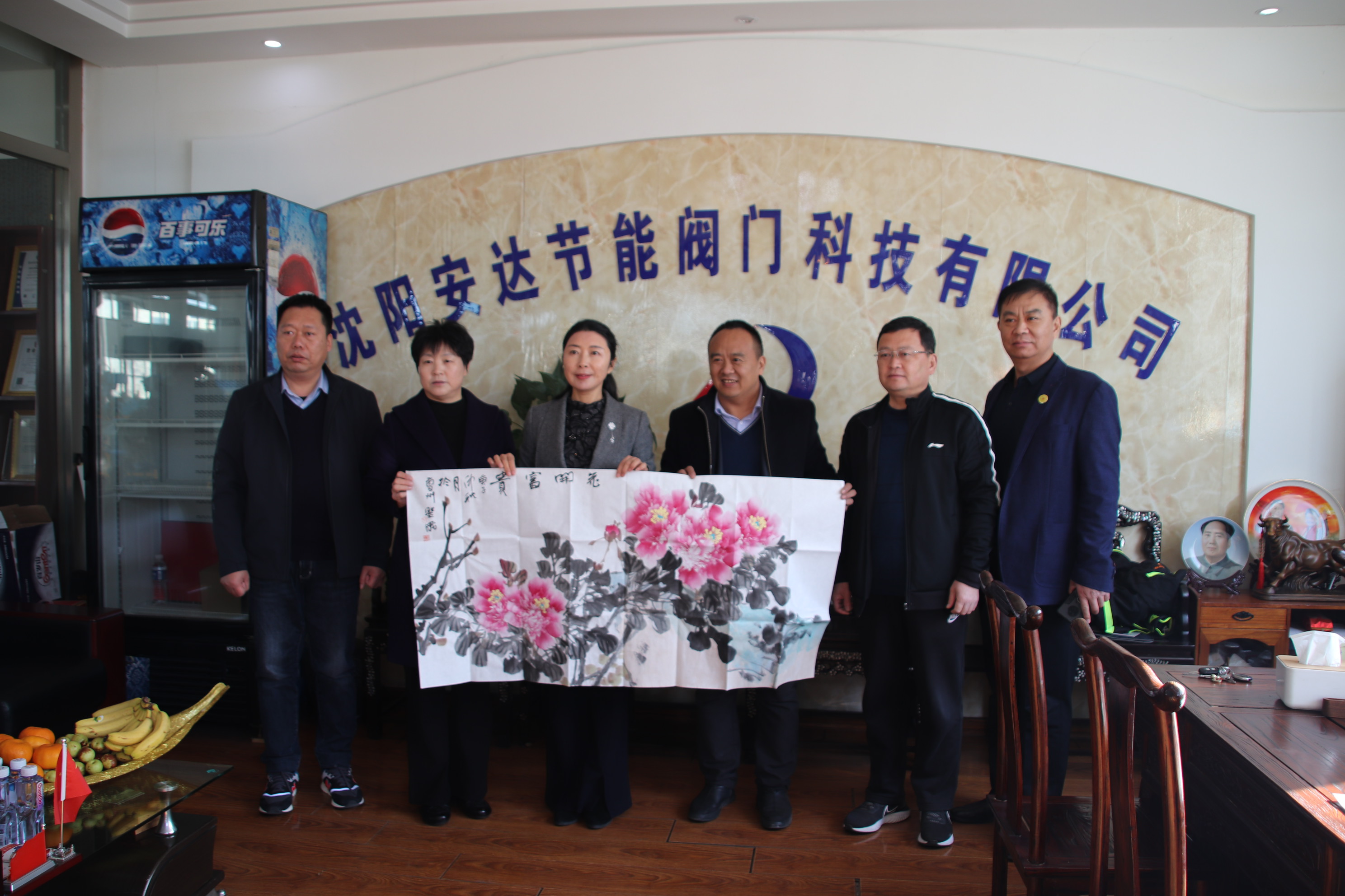 2020.11.8成武縣常務(wù)縣長王夢琳、成武縣人社局長祝兆東、南魯鎮(zhèn)書記程淵波等人走訪慰問家鄉(xiāng)駐沈企業(yè),并帶來家鄉(xiāng)字畫牡丹《花開富貴》!李敬安董事長代表安達科技全體員工表示熱烈歡迎!